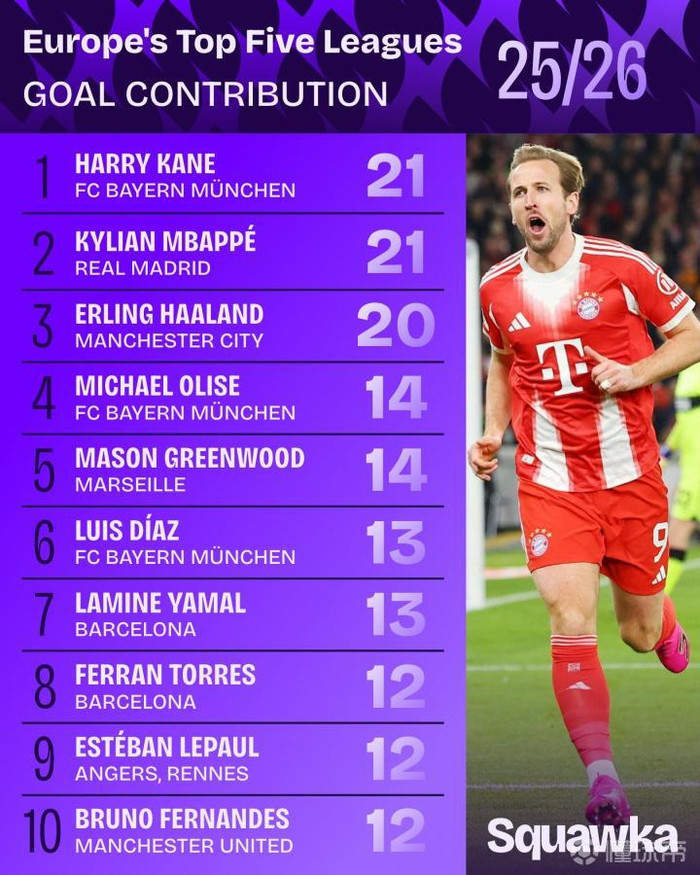 2025-26赛季五大联赛参与进球(进球+助攻)
