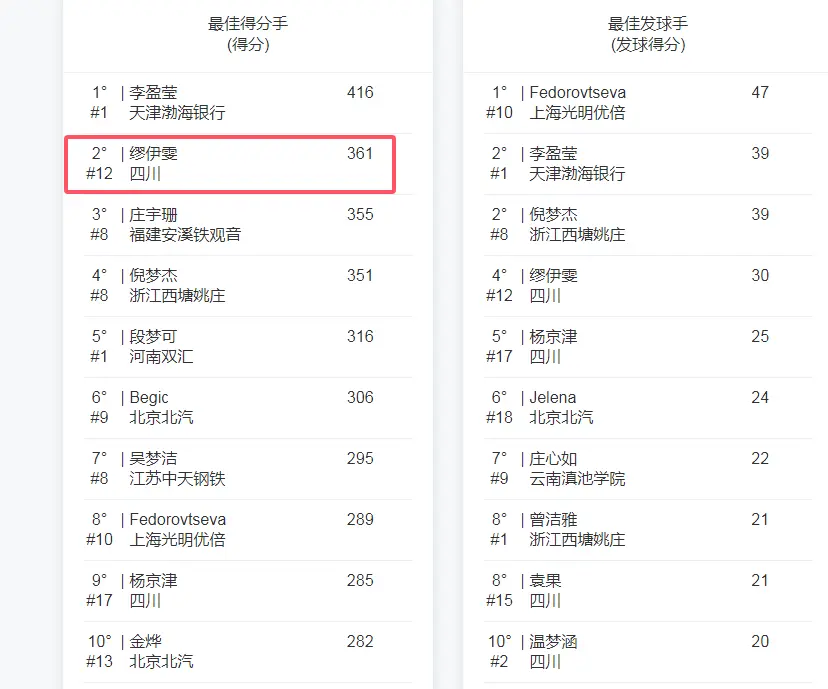 在本赛季女排联赛得分榜上,缪伊雯以361分排行第二,仅次于得到416分的李盈莹。庄宇珊355分排行第三,倪梦杰351分第四,段梦可316分第五,贝基奇306分第六,吴梦洁295分第七,费多罗夫采娃289分第八,杨京津285分第九,金烨282分第十。